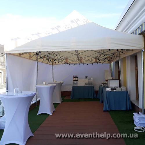 У нас уже неоднократно брали в аренду шатры на свадьбу в Киеве. Это удобная конструкции бежевого цвета со съемными стенками (высотой 2,2 м) и 3-х метровыми куполами. Общая площадь, которую занимает свадебный шатер, предлагаемый нами – 6х4м. На вид наш белый свадебный шатер – как новенький. Но стойко защищает от солнца, ветра, дождя и любой непогоды в Киеве.